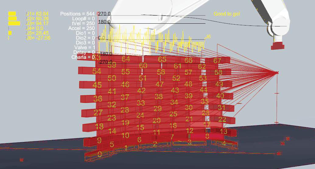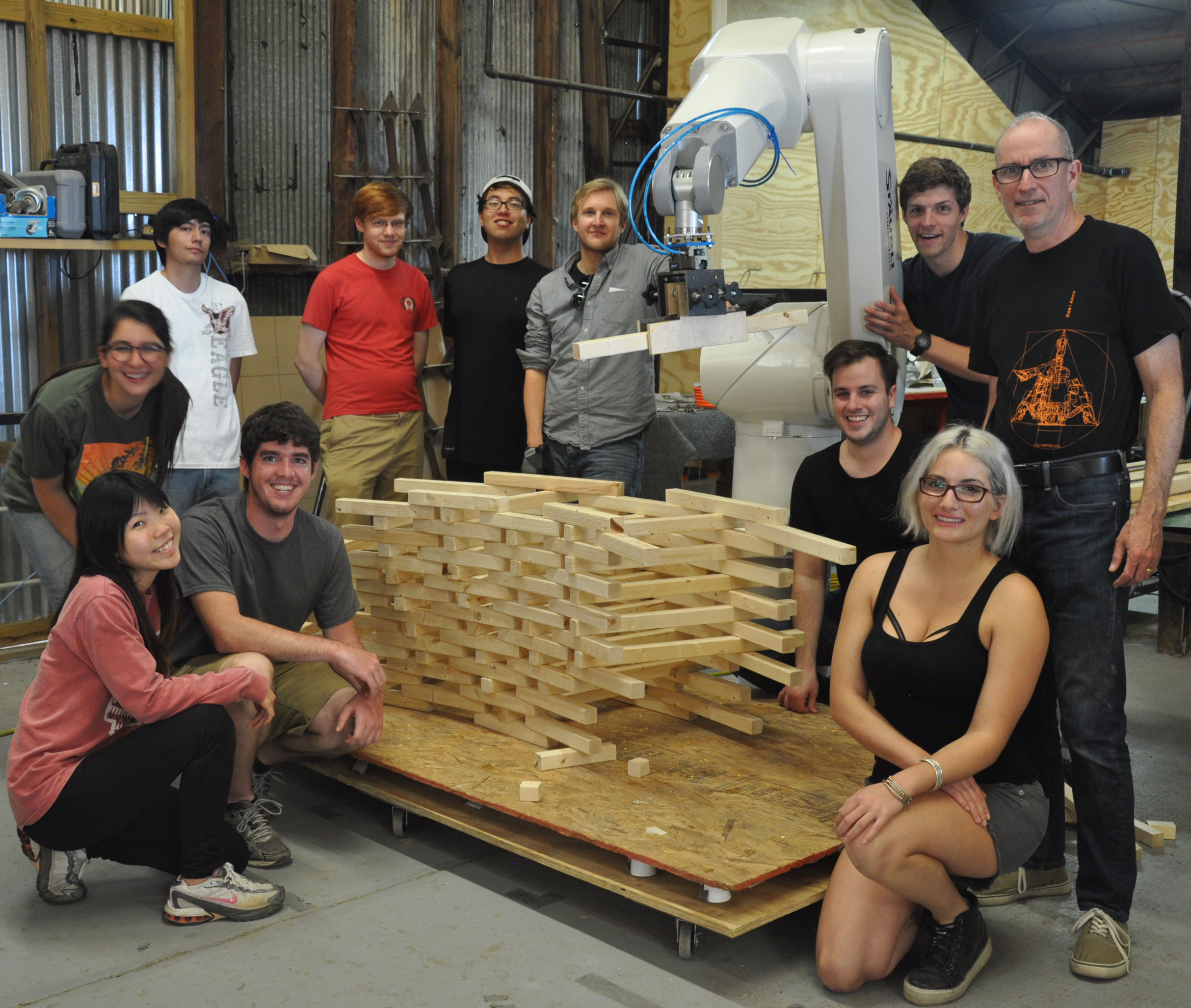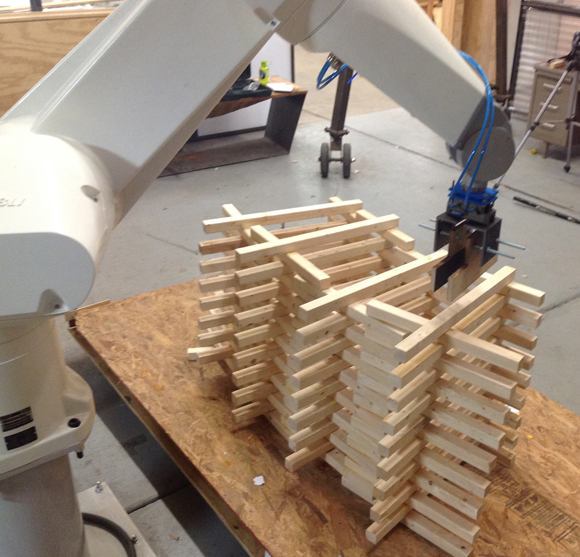 The FAYETTEVILLE BIKE TRAIL ROBOTICALLY FABRICATED PAVILION demonstrates the first project produced using a 6-Axis Robot Arm, at the Fay Jones School of Architecture in the Spring 2015 semester. The project is the result of an intensive design, fabrication and installation initiative from the 5th year ROBOTIC FABRICATION STUDIO, directed by Santiago R. Perez. Students were immersed in the rapid development of new skills including experimental material-processes, parametric modelling, and learning how to implement robotic trajectory control using the CRANE (rhino-grasshopper plugin) software developed originally for use in the SCIARC Robot House. Special thanks to Jake Newsum, Robot Lab Director at SCIARC, for getting us started with our 6-axis Staubli RX 160. Additional thanks to Brian Harms, developer of the original CRANE plugin, for his assistance and consultation. Stacking Video may be seen here. Additional project images may be seen here. |