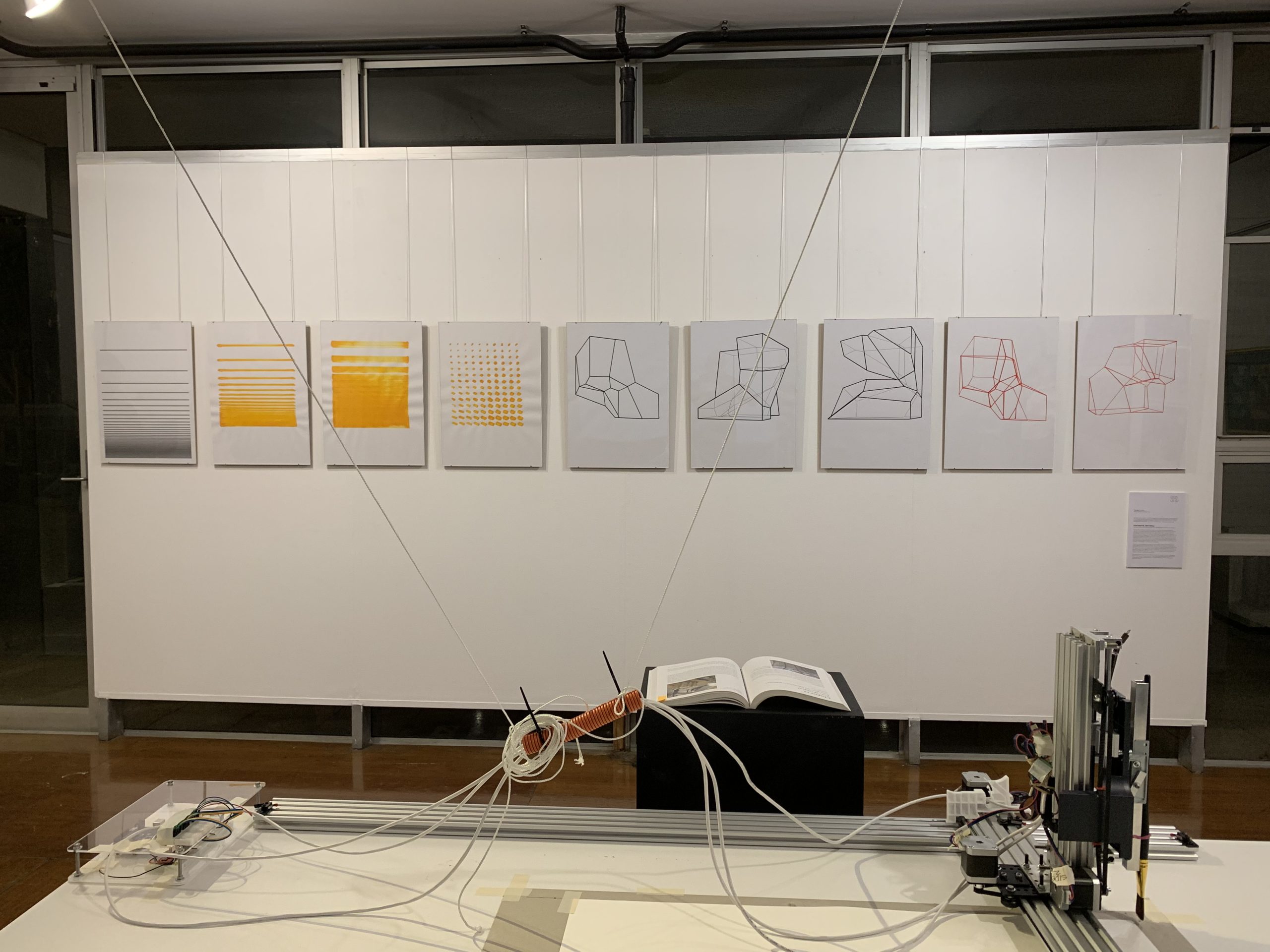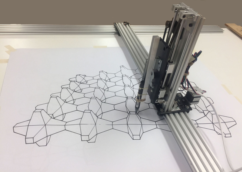 ![]() This work is research in progress, examining the “Loss of Control” in drawing and architecture. The era of the “PostDigital,” is characterized by the collapse of distinctions between the “newness” of the digital (now banal and ubiquitous), aspiring to create revolutionary tools and processes, and the return of the analog, now as agency rather than (nostalgic) vessel . It is characterized by the opportunistic mining of multiple domains (digital/physical, subjective experience / artificial intelligence), etc. towards new conceptualizations of line, space, form and materiality. PostDigital technologies and practices challenge designers to critically examine the changing conceptions of matter / material, transcending the physical / digital oppositions of an earlier generation. Within this context, the rise of AI, Robotics and related technologies, create both new speculative opportunities for design, and at the same time, posits the immanent “Loss of Control” of the designer, over both Form and Material. The work presented highlights the increasing “Loss of Control” posed by the introduction of Genetic Algorithms and AI, replacing composition as a generative method, by incorporation of computational development of a “series.” The work also interrogates PostdDigital imprecision and the “inexact,” at the level of a physical, material medium, by choosing pigments, markers etc. as opposed to “pixels” as the medium of choice. This decision is not meant however, as a means to return to a pre-digital era, but rather, to explore the as yet undiscovered nuances of physical mediums in the age of robotics and computation. The linear drawings and patterns are coded with specific computational routines, calibrated for pigment load, flow rate, brush overlap, etc. The architectural line drawings are produced with readily available scripts incorporating GA’s or “Fitness-Functions” trending towards a goal or target set of criteria. ![]() ![]() ![]() ![]() |